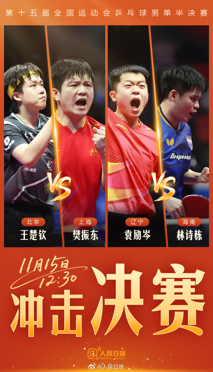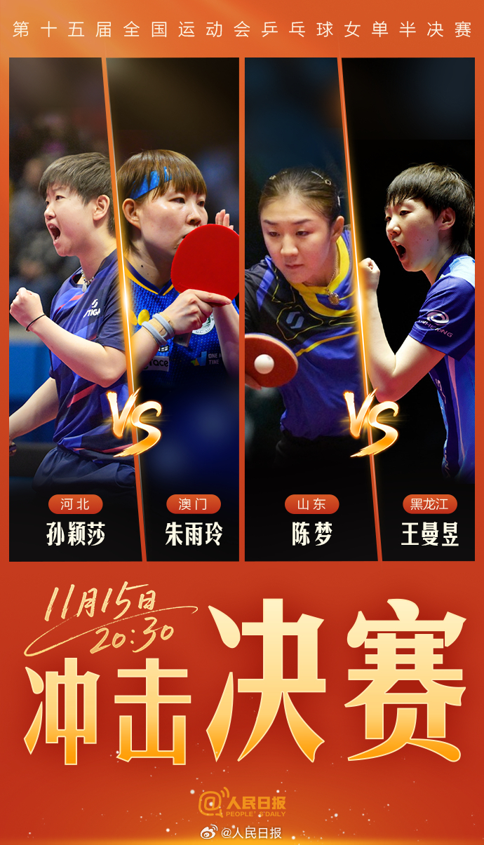 11月15日牛壹佰,第十五届全国运动会乒乓球半决赛将进行,为运动员们加油!