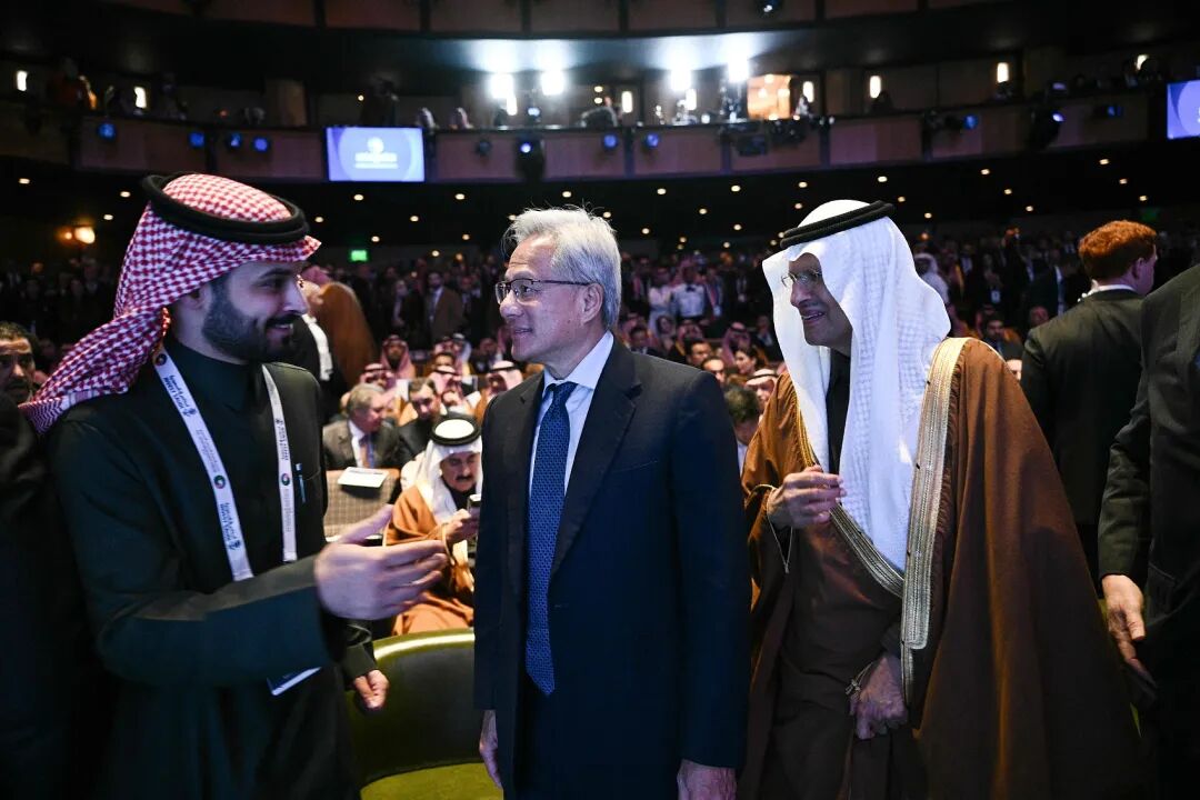 ● 当地时间2025年11月19日,美国华盛顿,英伟达(Nvidia)创始人兼首席执行官黄仁勋(中)在约翰·F·肯尼迪表演艺术中心举行的美沙投资论坛上与沙特阿拉伯代表团成员交谈。图源:视觉中国