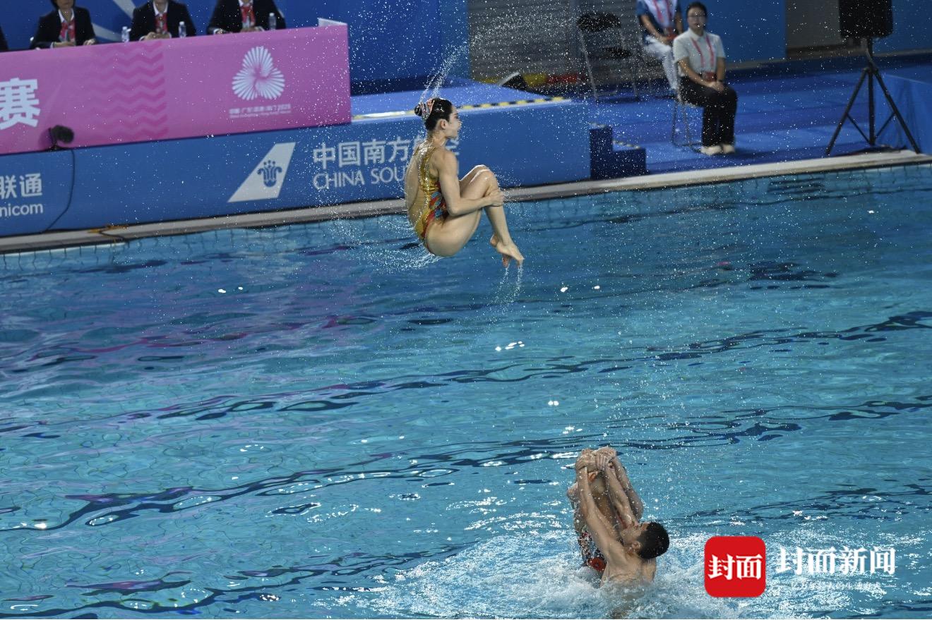 比赛集体技术自选和集体自由自选后,四川队总成绩排名第四,距离第三名分差有13分,最后一场比赛有三个重要托举的戴佳妮感受到了压力:“第一场比赛,我感觉体力有些不支,第二场没上,看比赛中有个托举失败了,觉得很遗憾,就感觉今天是我自己的最后一场谢幕战,最后一个托举是到这儿来才临时改的,加了0.4的难度,就是为了冲这块牌,压力也特别大,然后第七个托举做完,没想到做得那么好。”戴佳妮用自己全运会赛场的最后一跳,也是完美一跳,给自己22年的花样游泳运动员生涯画上了完美的句号。
